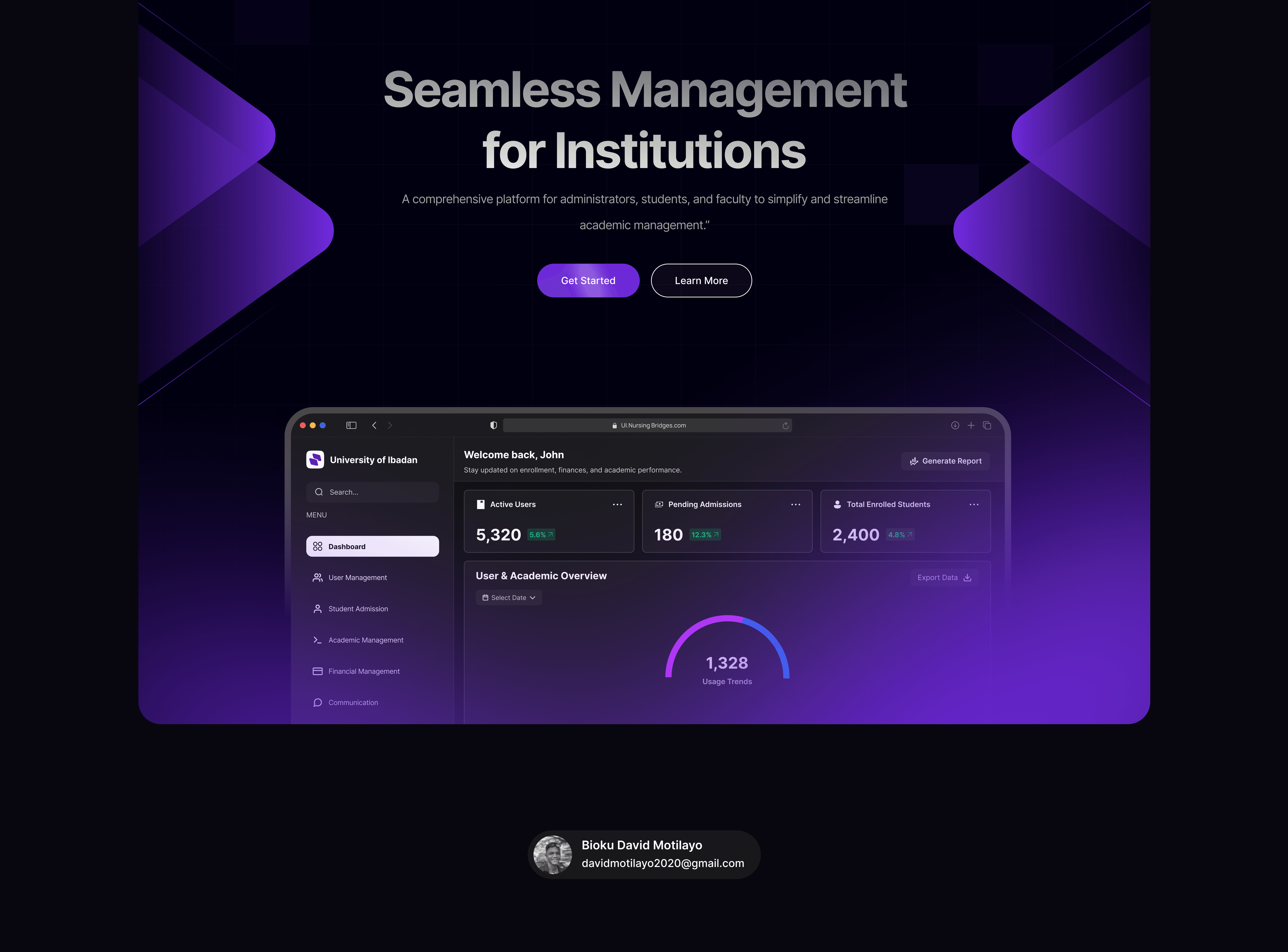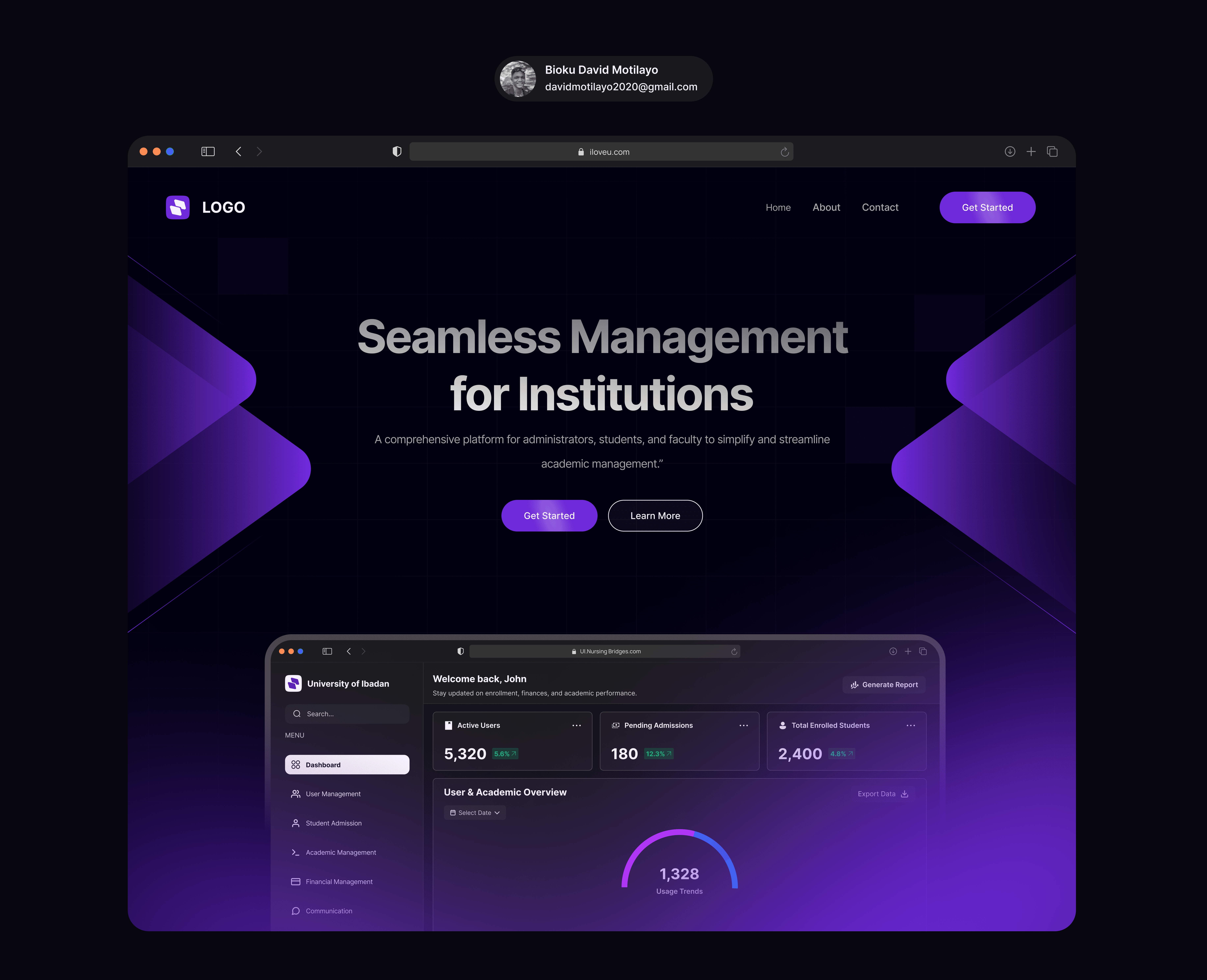 The design uses a dark, futuristic aesthetic paired with vibrant purple gradients to convey innovation and reliability. A grid-inspired background enhances structure, while smooth rounded components create a polished visual hierarchy. Each dashboard module—user management, academic records, financial management, admission tracking—was organized for clarity, enabling admins to access insights instantly.